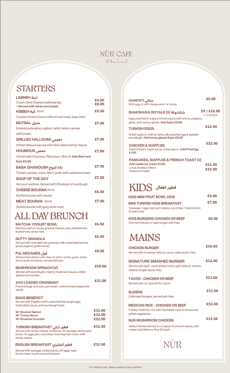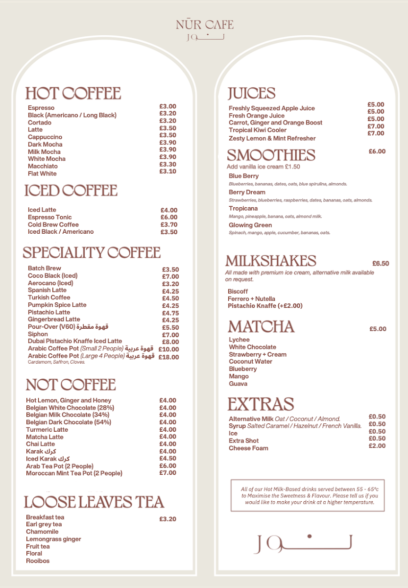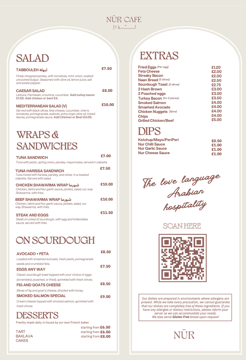 If you're looking for a relaxing café experience in central Manchester that blends modern elegance with Middle Eastern culinary flair, the Nùr Cafe Manchester Menu is worth exploring. Situated at 45 Deansgate, this stylish café has built a reputation for offering more than just good coffee-it’s a destination for flavorful, well-crafted dishes and a calming ambiance.